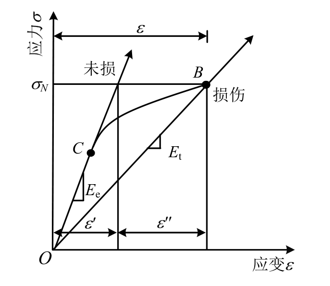 假定损伤后单元i的刚度降低,其截面面积不变,弹性模量发生缩减。定义图2中OC段所在直线的斜率为单元i的初始弹性模量Ee,定义直线OB的斜率为单元i损伤后弹性模量Et,此时,B点状态下单元i的损伤指数αi可表示为: