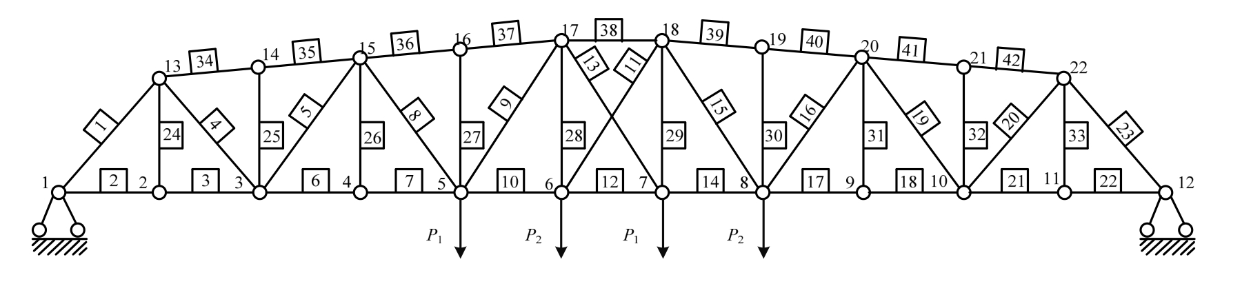 在ANSYS软件平台建立平面有限元模型,如图4所示,模型中每榀桁架共有22个节点、44个单元,11个节间,两端铰接。材料的弹性模量为206 GPa,上弦杆、下弦杆、竖杆、端斜杆、斜腹杆截面积分别为 0.0512 m2、0.03984 m2、0.01514 m2、0.05645 m2、0.02432 m2,钢材密度7.85 g/cm3,泊松比取0.2。在主桁杆件损伤识别之前,依据现场实测结果,将初始模型修正为符合现阶段桥梁真实情况的有限元模型,保证数值模拟结果和实测结果一致[23]。