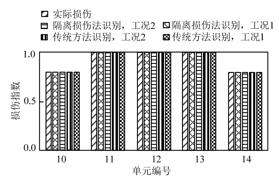 在两种工况作用下,隔离损伤法和传统方法的损伤识别结果如图8所示,可知,隔离损伤法和传统方法均能够精确地识别出结构的损伤指数,5个单元中只有单元10和单元14发生了损伤,损伤指数分别为0.8和0.6,其物理意义为单元损伤前后弹性模量的比值,例如损伤指数为0.8表示单元10损伤后弹性模量是未损伤的0.8倍,即弹性模量下降了20%。此外,隔离损伤法和传统方法分别与真实损伤相比,其识别结果的最大的相对误差分别为0.62%和0.58%,可以忽略。表明了隔离损伤法能够精确地进行结构损伤识别。