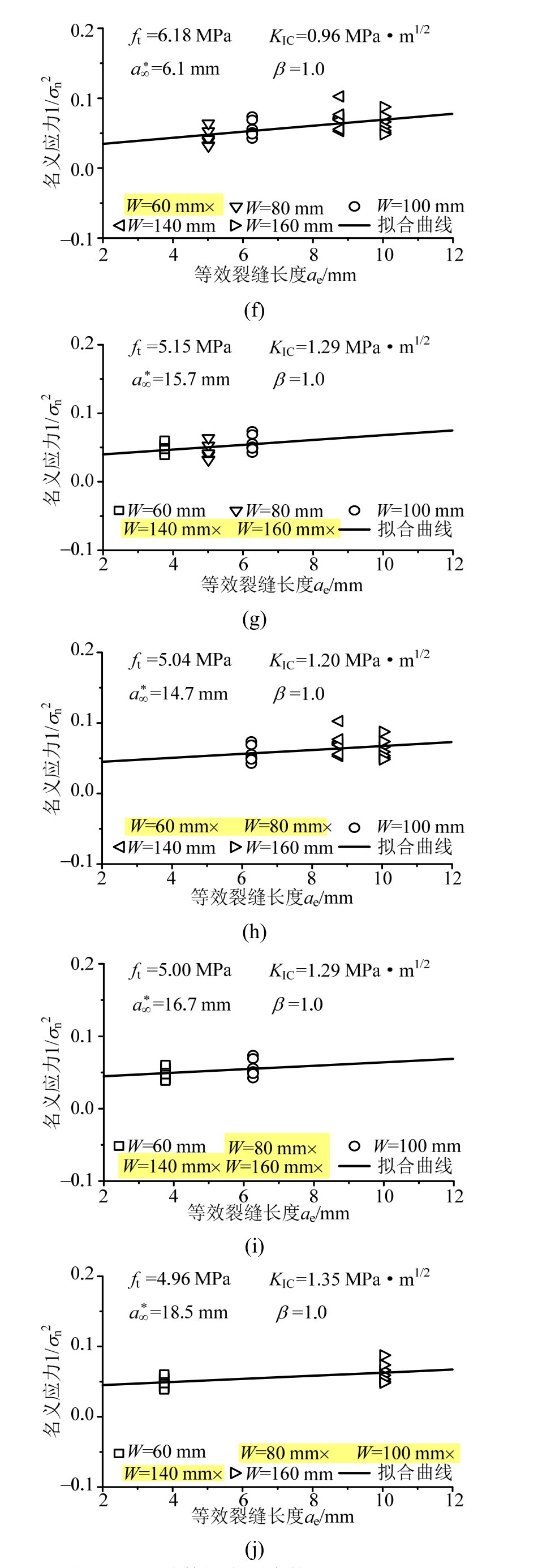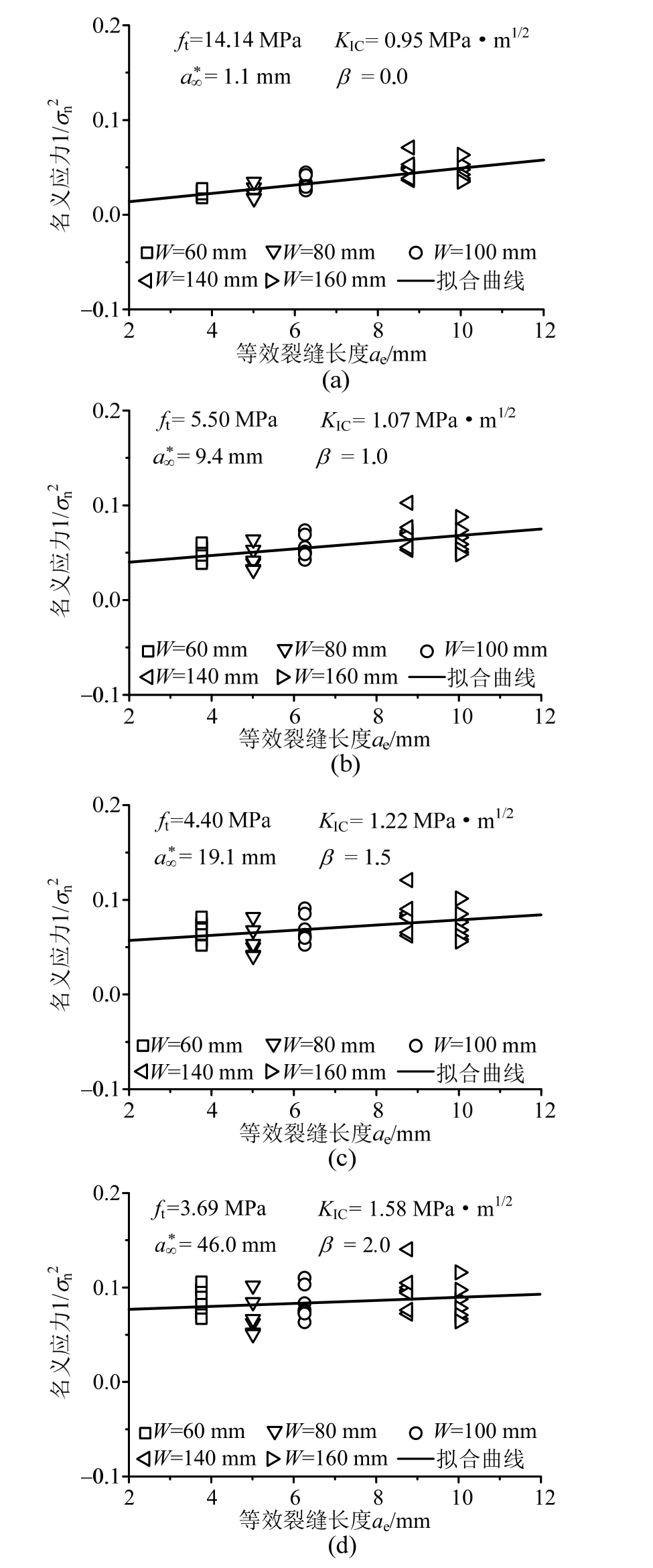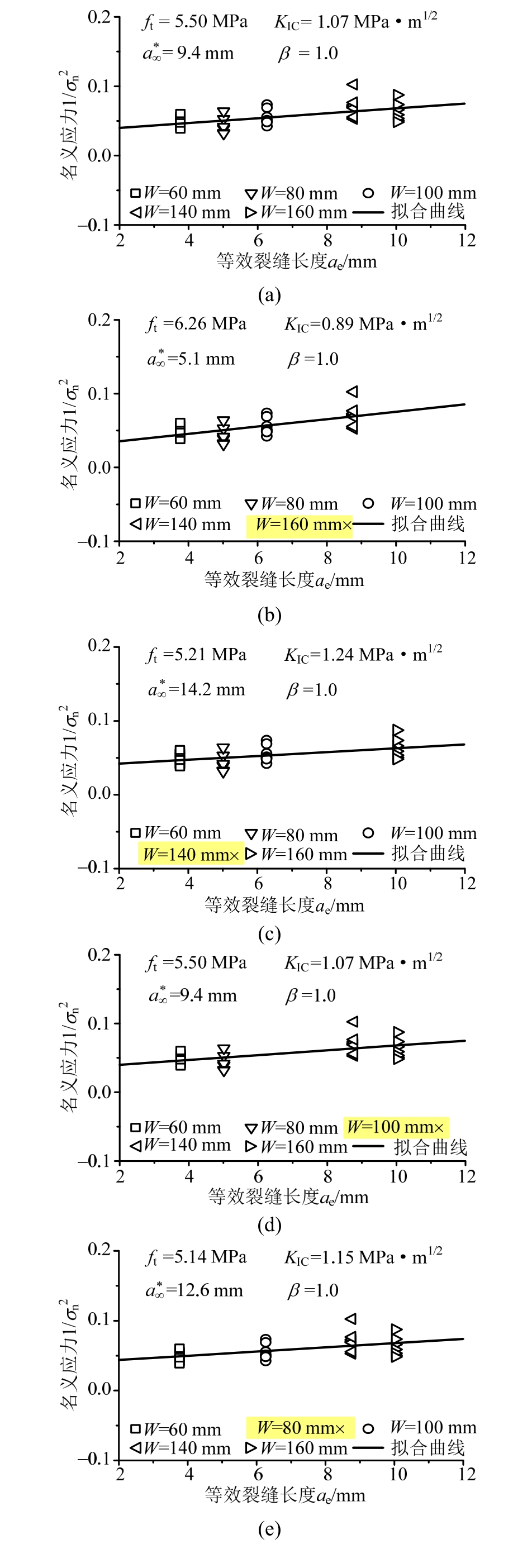 文献[33]进行了骨料最大粒径dmax=10 mm,试件高度W=60 mm、80 mm、100 mm、140 mm、160 mm的小尺寸试件断裂试验。其试件厚度B=40 mm,缝高比a0/W=0.3,跨高比S/W=4。则相对尺寸W/dmax=6~16;韧带高度的相对尺寸(W-a0)/dmax=4~11;试件厚度相对尺寸B/dmax=4。可见,文献[33]所用试件不满足尺寸效应模型要求的最小尺寸与最大尺寸比为1:4的完全几何相似情况。但由于试件高度W变化,则可对应于不同的几何结构参数ae;同时可试验得到不同峰值荷载Pmax,进而得到不同结构名义应力σn,因此,具备由边界效应理论回归分析确定材料参数的条件。