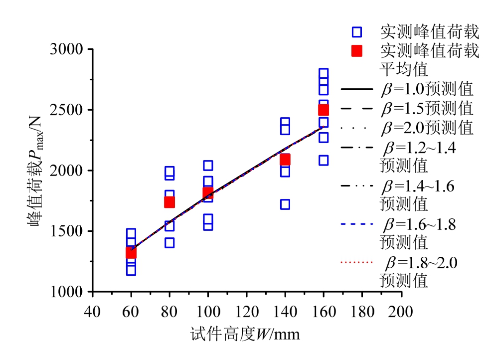 作为预测全曲线中的一个应用特例,当分别取β=1.0、1.5、2.0、1.2~1.4、1.4~1.6、1.6~1.8、1.8~2.0确定材料参数后,预测峰值荷载与实测峰值荷载随试件高度的变化规律如图6所示。