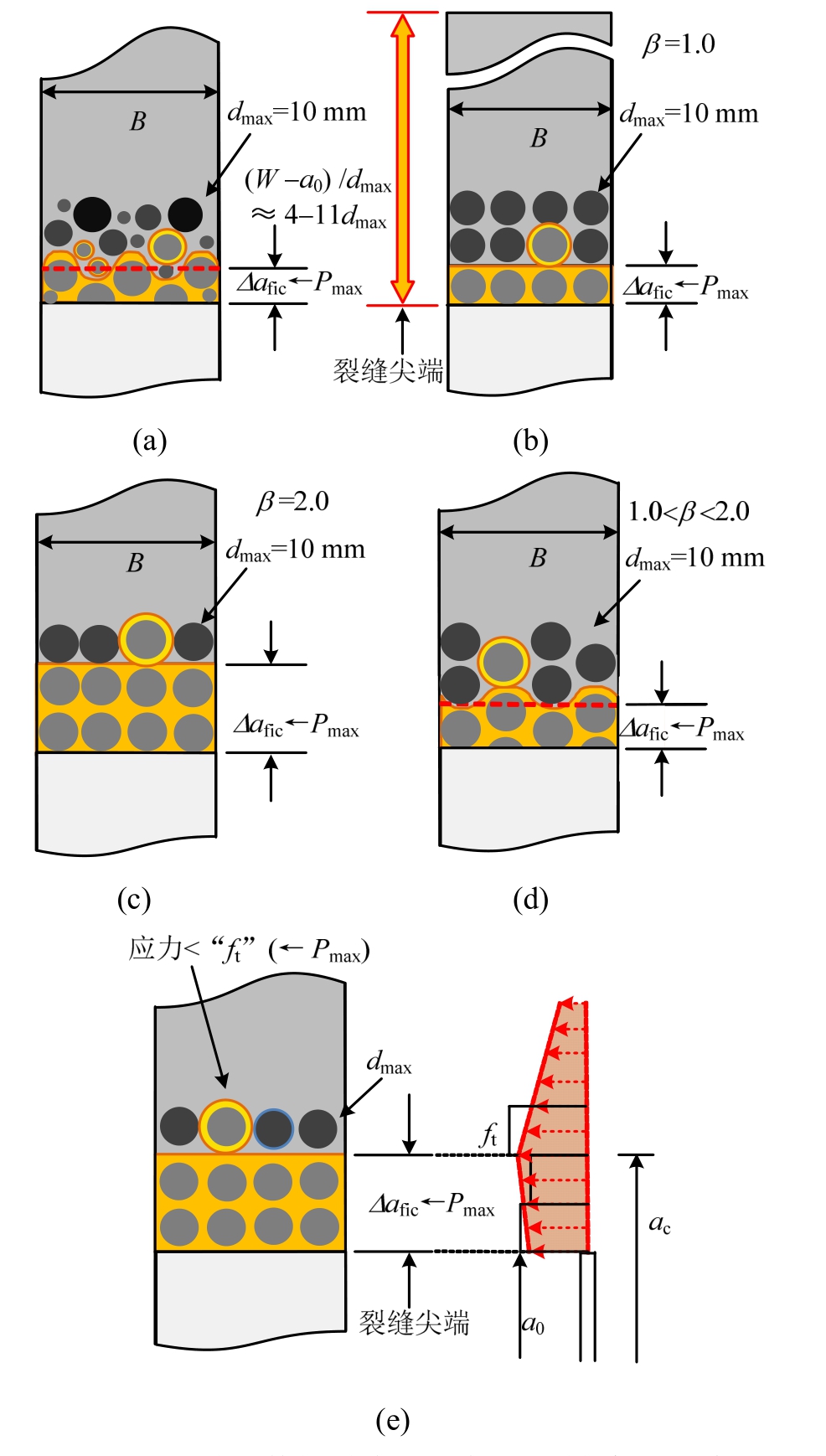 式中:dmax为骨料颗粒的最大粒径;β为离散度参数,取决于混凝土浇筑质量、骨料分布与排列等情况。实际的混凝土试件骨料分布情况并不是每排整齐排列,若考虑骨料的错动等随机分布,β还可个性化取值,如图1(d)所示的1.0<β<2.0。而当其他粒径的骨料dn(n=1,2,3…)含量占主导时,可将骨料最大粒径dmax替换为dn考虑。