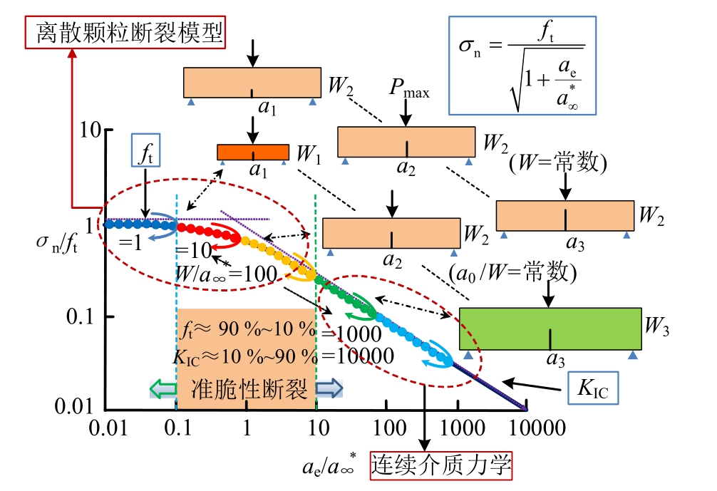 处于准脆性断裂状态,试件破坏同时受控于断裂韧度准则与强度准则(ft≈90%~10%;KIC≈10%~90%)。对于处于准脆性断裂状态的小尺寸试件,可采用两类方法获取其无尺寸效应的断裂参数:(1)建立非线弹性断裂模型,考虑虚拟裂缝扩展,由等效裂缝长度代替初始裂缝长度,计算等效断裂韧度作为混凝土的材料参数。采用该方法较为著名断裂模型如双K模型[6,33-34]、双参数模型[35-36]、等效裂缝模型[37-39]等。(2)通过两极限准则(断裂韧度KIC和拉伸强度ft)来确定小尺寸试件的准脆性断裂状态。即采用a)无限大板含有长裂缝情况对应的无尺寸效应的断裂韧度KIC;b)未含裂缝试件对应的无尺寸效应的拉伸强度ft。相应地,如果已知小尺寸试件的试验结果,也可通过数据拟合回归,外推确定两个材料参数KIC和ft。Bažant所提尺寸效应模型SEM[14]及边界效应模型BEM[17-23]即采用此方法。