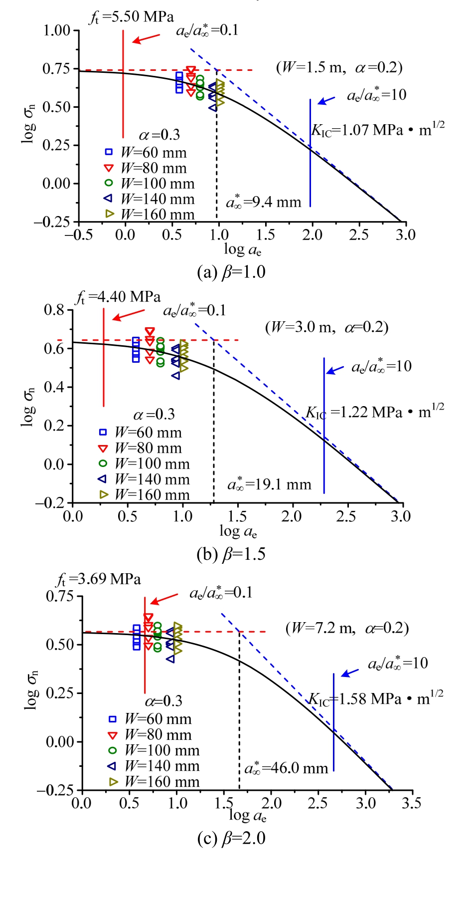 不同条件KIC/(MPa·m1/2)ft/MPaa*∞/mmβ=0.5,W=40 mm;β=1.5,W=160 mm 0.74 13.5 0.7β=1.0,W=40 mm;β=3.0,W=160 mm 0.60 13.2 0.5β=1.0,W=40 mm;β=2.0,W=160 mm 0.76 7.00 2.9β=1.0,W=40 mm;β=1.5,W=160 mm 0.88 6.09 5.2β=1.5,W=40 mm;β=2.0,W=160 mm 0.94 4.69 10.1β=2.0,W=40 mm;β=2.5,W=160 mm 1.07 3.87 19.1β=1.2,W=40 mm;β=1.4,W=160 mm 1.01 5.15 9.7β=1.2,W=40 mm;β=1.6,W=160 mm 0.93 5.33 7.7β=1.4,W=40 mm;β=1.6,W=160 mm 1.05 4.70 12.6β=1.4,W=40 mm;β=1.8,W=160 mm 0.96 4.84 9.9β=1.6,W=40 mm;β=1.8,W=160 mm 1.12 4.33 16.7β=1.8,W=40 mm;β=2.0,W=160 mm 1.20 4.02 22.1β=2.0,W=40mm;β=2.2,W=160mm 1.32 3.75 30.9