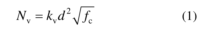 式中:Nv为螺栓连接每一剪面承载力;kv为螺栓连接承载力计算系数;d为螺栓直径;fc为顺纹承压强度。对于钢夹板螺栓连接,kv取7.5,如前文所示,fc取 66.5 MPa,由于规范并未提出多螺栓群体作用因素,有效螺栓个数计算采用Eurocode 5[5]公式。