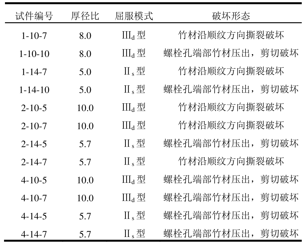 试件编号 厚径比 屈服模式 破坏形态1-10-7 8.0 Ⅲd型 竹材沿顺纹方向撕裂破坏1-10-10 8.0 Ⅲd型 螺栓孔端部竹材压出,剪切破坏1-14-7 5.0 Ⅱs型 竹材沿顺纹方向撕裂破坏1-14-10 5.0 Ⅱs型 螺栓孔端部竹材压出,剪切破坏2-10-5 10.0 Ⅲd型 竹材沿顺纹方向撕裂破坏2-10-7 10.0 Ⅲd型 竹材沿顺纹方向撕裂破坏2-14-5 5.7 Ⅱs型 螺栓孔端部竹材压出,剪切破坏2-14-7 5.7 Ⅱs型 竹材沿顺纹方向撕裂破坏4-10-5 10.0 Ⅲd型 螺栓孔端部竹材压出,剪切破坏4-10-7 10.0 Ⅲd型 螺栓孔端部竹材压出,剪切破坏4-14-5 5.7 Ⅱs型 螺栓孔端部竹材压出,剪切破坏4-14-7 5.7 Ⅱs型 螺栓孔端部竹材压出,剪切破坏