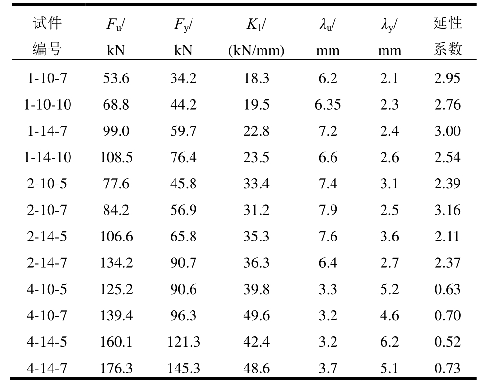 试件编号Fu/kNFy/λy/kNK1/(kN/mm)λu/mm mm延性系数1-10-7 53.6 34.2 18.3 6.2 2.1 2.95 1-10-10 68.8 44.2 19.5 6.35 2.3 2.76 1-14-7 99.0 59.7 22.8 7.2 2.4 3.00 1-14-10 108.5 76.4 23.5 6.6 2.6 2.54 2-10-5 77.6 45.8 33.4 7.4 3.1 2.39 2-10-7 84.2 56.9 31.2 7.9 2.5 3.16 2-14-5 106.6 65.8 35.3 7.6 3.6 2.11 2-14-7 134.2 90.7 36.3 6.4 2.7 2.37 4-10-5 125.2 90.6 39.8 3.3 5.2 0.63 4-10-7 139.4 96.3 49.6 3.2 4.6 0.70 4-14-5 160.1 121.3 42.4 3.2 6.2 0.52 4-14-7 176.3 145.3 48.6 3.7 5.1 0.73