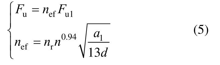 式中:Fu为多螺栓连接承载力;Fu1为单个螺栓的承载力;nef为螺栓的有效个数;nr为螺栓列数;n为每列螺栓的个数;a1为螺栓沿顺纹方向的间距。