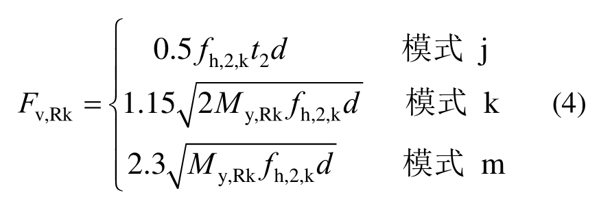 式中:Fv,Rk为每个剪切面上的承载力;t2为中间竹材厚度;fh,2,k为竹材的销槽承压强度;My,Rk为螺栓的屈服弯矩,My,Rk=(fbsd3)/6。