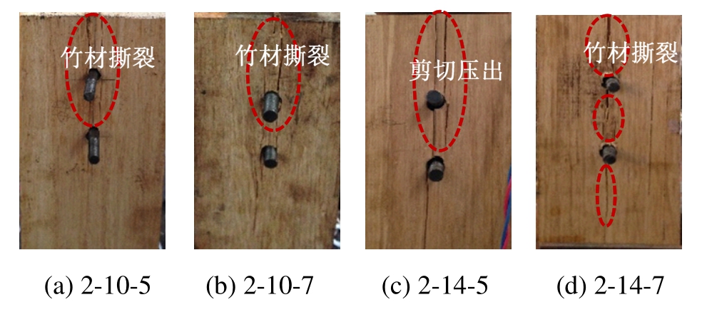 试验开始后,竹材很快便出现纤维撕裂的声音,随着位移的不断增大,螺杆直径较小的连接由于螺栓的变形可以看到螺杆露出部分有明显的翘曲,部分试件中螺栓孔两端竹材被剪切破坏而顶出,到试验后期会出现竹材撕裂的脆响,之后可以看到试件在顶端出现裂缝。