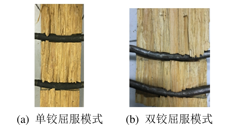 从图8可以看出,对于多螺栓连接试件,当厚径比为5.7时,出现Ⅱs型破坏模式,此时螺栓直径较大而竹材厚度较小,为单铰屈服模式,如图8(a)所示。当厚径比为10.0时,出现Ⅲd型屈服模式,此时直径较小而竹材厚度较大,为双铰屈服模式,如图8(b)所示。