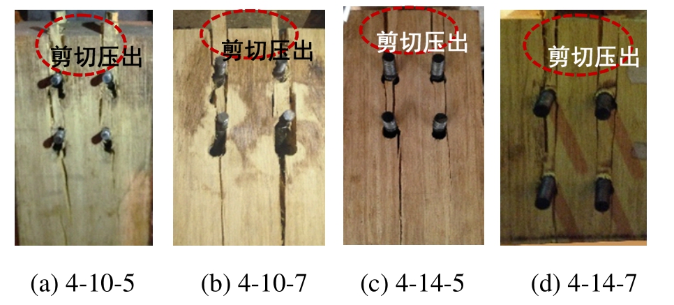 试验加载初期,竹材很快出现纤维撕裂的声音,加载后期会出现不同程度的竹材撕裂的脆响,直径较小的螺栓明显翘曲。试件接近破坏时往往伴随着竹材撕裂的脆响,螺栓连接可以明显看见竹材沿螺栓孔剪切破坏被挤出,其破坏形态如图7所示。