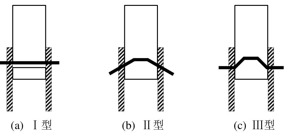 根据 Johanson[7]总结的钢夹板螺栓连接常见的破坏模式可以分为以下三种:当竹材厚度较薄时,破坏形态为单纯的销槽承压破坏,破坏形态为Ⅰ型;随着竹材厚度的增加,螺栓连接向销槽承压破坏和螺栓弯曲同时发生演变,当两侧钢板厚度较小时(不大于 0.5d),破坏形态为Ⅱ型;当两侧钢板厚度较大时(不小于螺栓直径d),破坏形态为Ⅲ型,具体的破坏模式如图2所示。