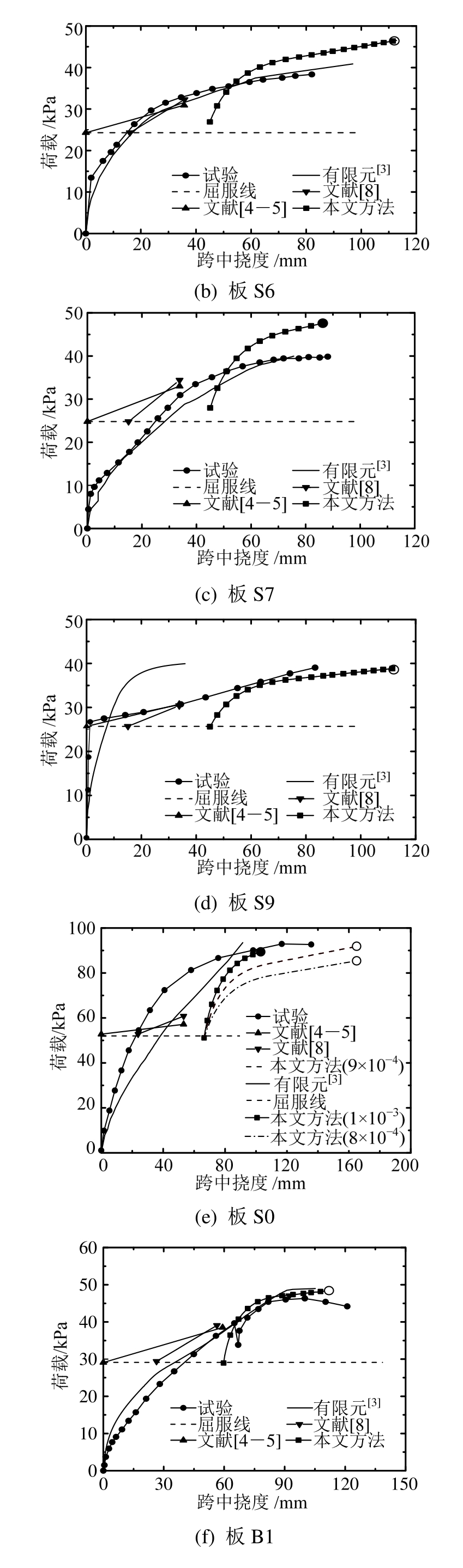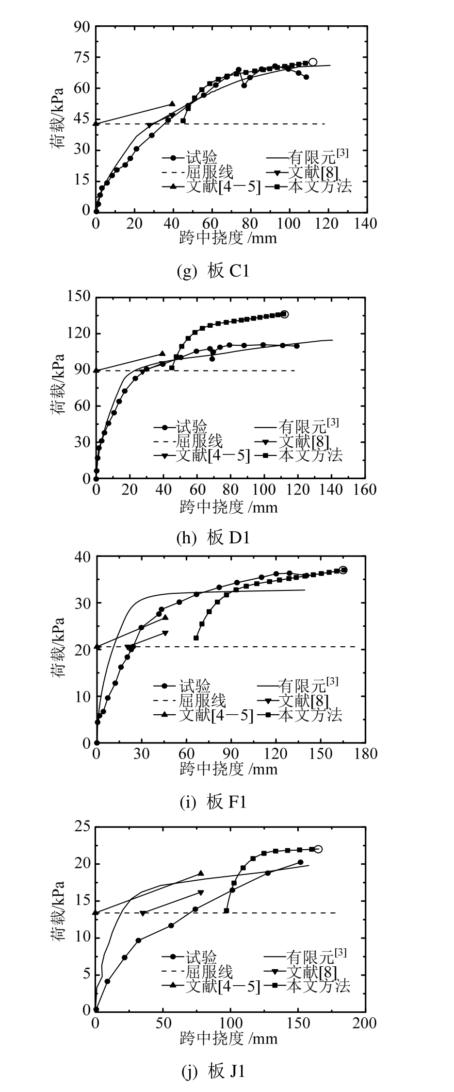 可见本文模型所得屈服荷载后荷载-变形为曲线关系,且随着变形增大,曲线斜率逐渐降低,即刚度逐渐降低,与试验曲线总体吻合较好。因此,相比其他方法,本文理论方法所得结果是相对合理的。值得指出的是,对于本文方法,初始荷载取值通常应略高于或基本上接近于屈服荷载值。
