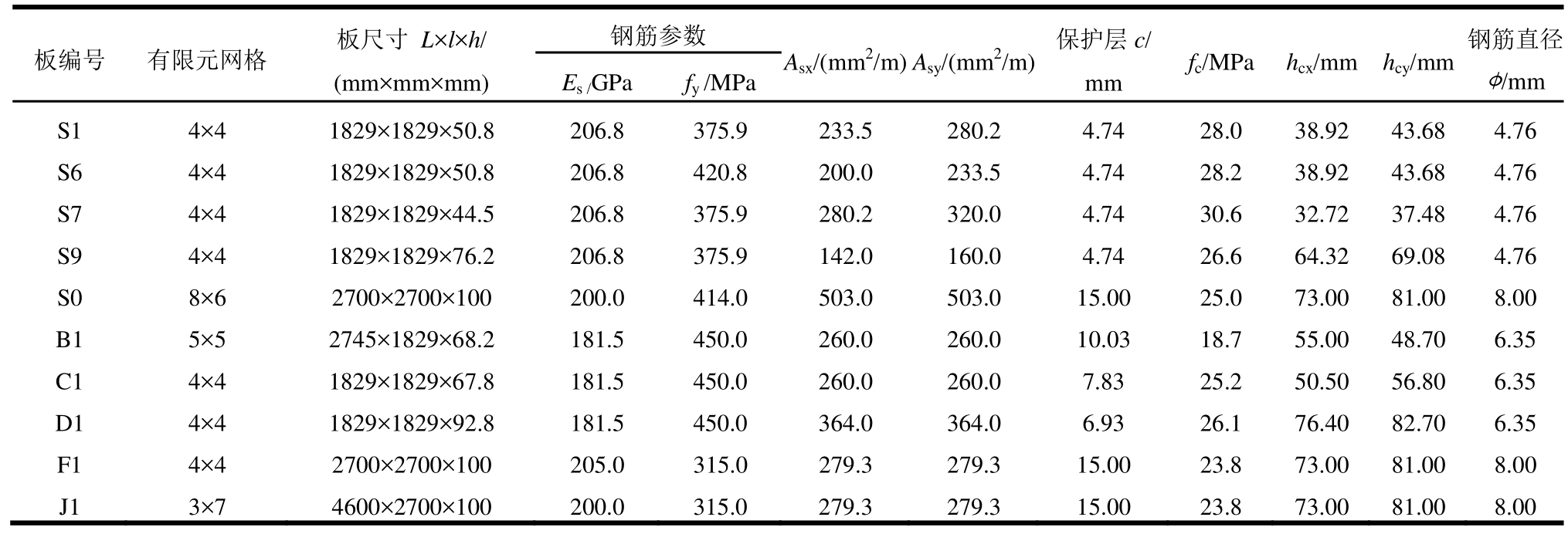 板编号 有限元网格 板尺寸L×l×h/(mm×mm×mm)钢筋参数Es/GPafy/MPaAsx/(mm2/m)Asy/(mm2/m)保护层c/mmfc/MPahcx/mmhcy/mm钢筋直径φ/mm S1 4×4 1829×1829×50.8 206.8 375.9 233.5 280.2 4.74 28.0 38.92 43.68 4.76 S6 4×4 1829×1829×50.8 206.8 420.8 200.0 233.5 4.74 28.2 38.92 43.68 4.76 S7 4×4 1829×1829×44.5 206.8 375.9 280.2 320.0 4.74 30.6 32.72 37.48 4.76 S9 4×4 1829×1829×76.2 206.8 375.9 142.0 160.0 4.74 26.6 64.32 69.08 4.76 S0 8×6 2700×2700×100 200.0 414.0 503.0 503.0 15.00 25.0 73.00 81.00 8.00 B1 5×5 2745×1829×68.2 181.5 450.0 260.0 260.0 10.03 18.7 55.00 48.70 6.35 C1 4×4 1829×1829×67.8 181.5 450.0 260.0 260.0 7.83 25.2 50.50 56.80 6.35 D1 4×4 1829×1829×92.8 181.5 450.0 364.0 364.0 6.93 26.1 76.40 82.70 6.35 F1 4×4 2700×2700×100 205.0 315.0 279.3 279.3 15.00 23.8 73.00 81.00 8.00 J1 3×7 4600×2700×100 200.0 315.0 279.3 279.3 15.00 23.8 73.00 81.00 8.00