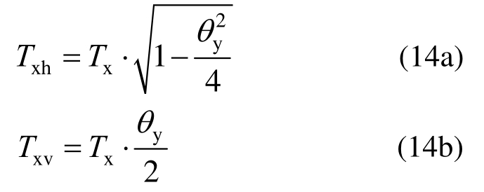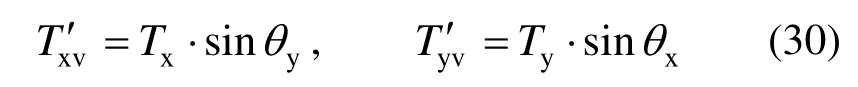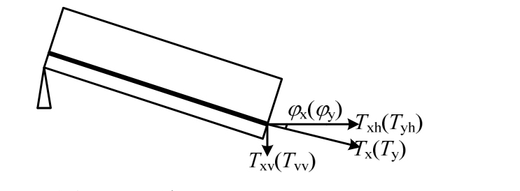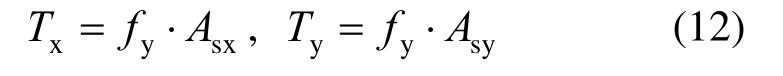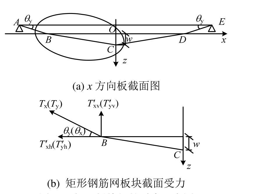 由图14(b)可知,x方向和y方向混凝土板中部钢筋网钢筋力与x(y)轴的夹角分别为yθ和xθ。因此x方向和y方向钢筋竖向分力分别为: