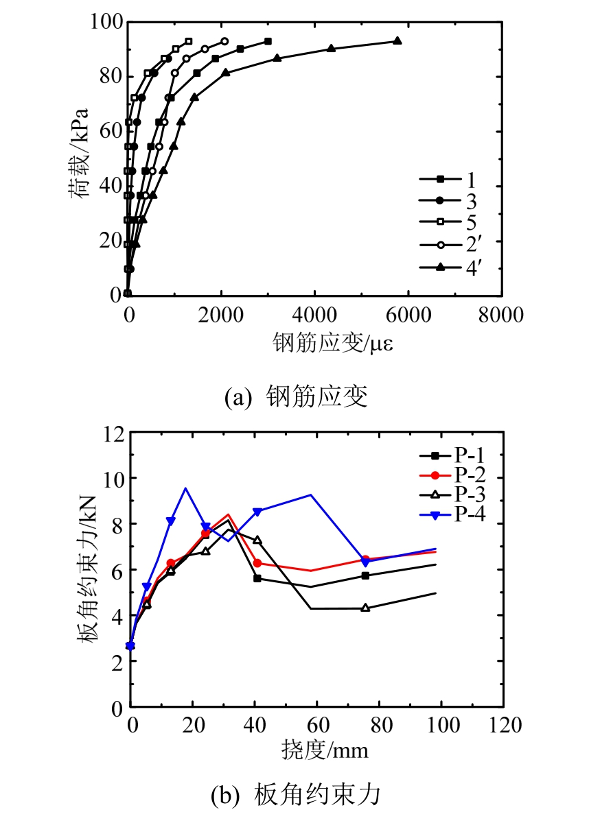 图7 试验板荷载-钢筋应变及板角约束力关系曲线