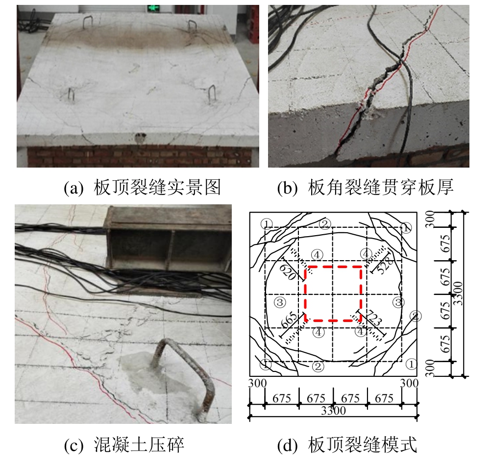 (1) 试验板板底呈现对角斜裂缝和中心方形网状裂缝;板顶出现板角斜裂缝及其附近区域出现压碎破坏;板角斜裂缝对板角约束力发展有重要影响;