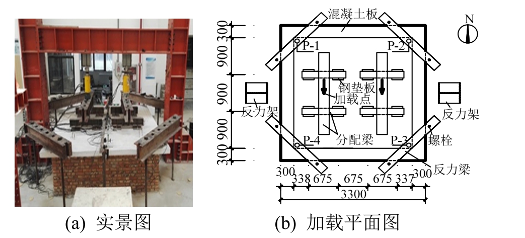 按照《混凝土结构试验方法标准》(GBT 50152―2012)[23]进行混凝土简支板承载试验,采用分配梁系统和液压千斤顶进行加载,以模拟均布荷载,且通过反力梁对板角进行竖向约束,如图1所示。