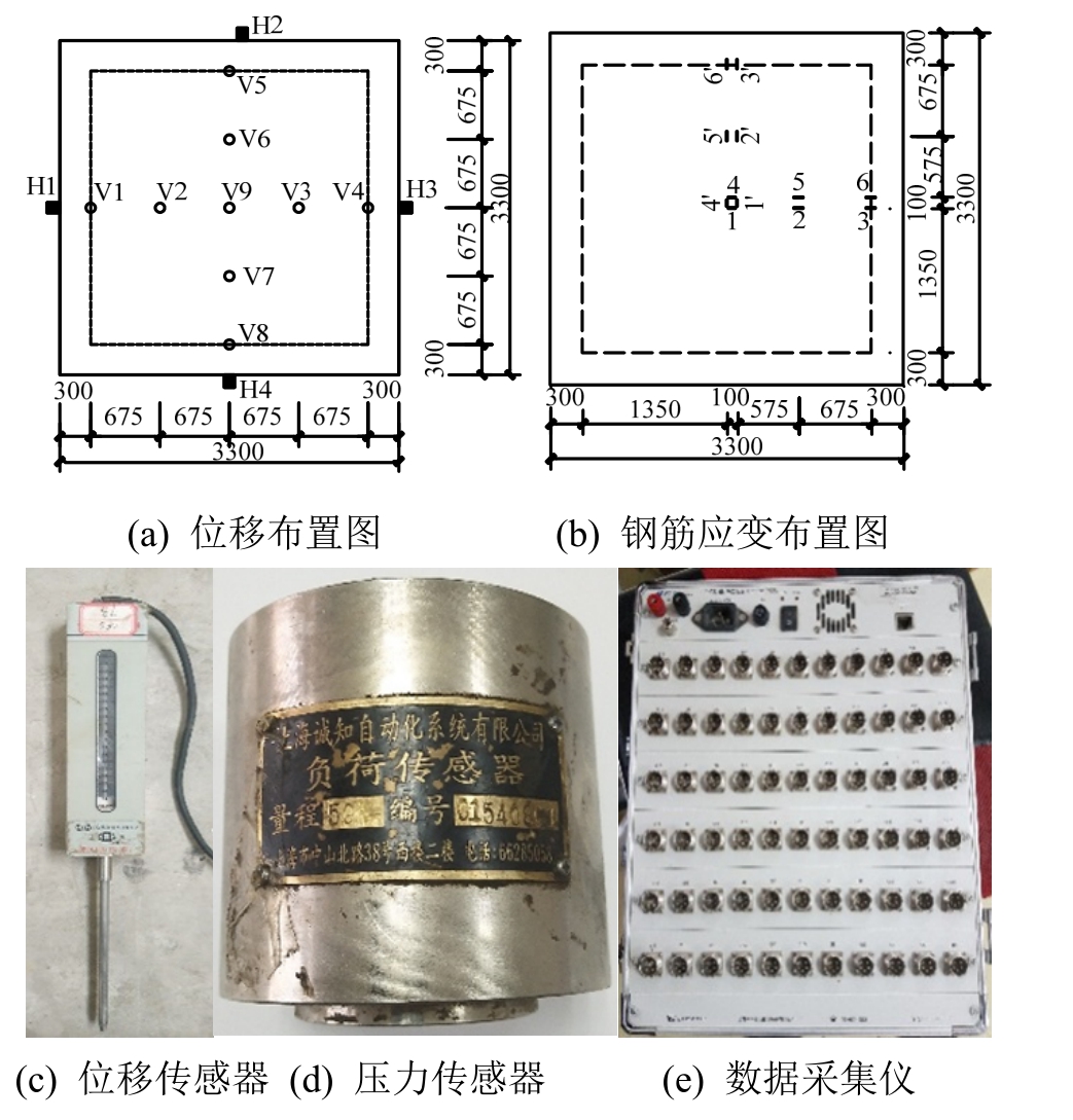 板角反力梁与试验板间设置压力传感器(BHR-46),对四板角约束力进行测量,即测点P-1~P-4,如图2(d)所示。压力数据由静态电阻应变仪(DH3818)采集,如图2(e)所示。