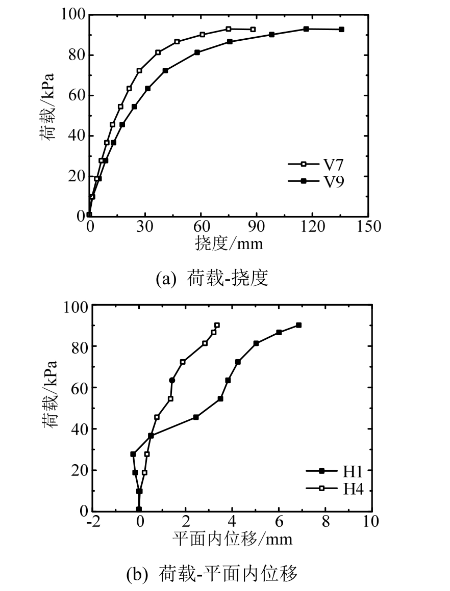 试验板荷载-挠度(平面外位移)曲线如图6(a)所示。由图可知,加载初期,试验板刚度较大,挠度随荷载呈线性发展;随着裂缝开展和钢筋屈服,荷载-挠度逐渐呈现为曲线关系。值得指出的是,按照塑性铰线理论,试验板极限承载力为 52.8 kPa。然而,由于受拉薄膜效应,试验板仍具有较强刚度和承载力,随着荷载增加,变形逐渐增加,但曲线斜率逐渐降低,即板刚度逐渐降低。当荷载达到92.7 kPa时,试验板出现压碎破坏,相应跨中挠度为136 mm。