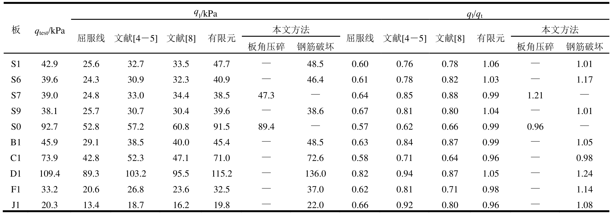 ql/kPaql/qt板qtest/kPa 屈服线 文献[4―5]文献[8]有限元 本文方法 屈服线 文献[4―5]文献[8]有限元 本文方法板角压碎 钢筋破坏 板角压碎 钢筋破坏S1 42.9 25.6 32.7 33.5 47.7 — 48.5 0.60 0.76 0.78 1.06 — 1.01 S6 39.6 24.3 30.9 32.3 40.9 — 46.4 0.61 0.78 0.82 1.03 — 1.17 S7 39.0 24.8 33.0 34.4 38.5 47.3 — 0.64 0.85 0.88 0.99 1.21 —S9 38.1 25.7 30.7 30.4 39.6 — 38.6 0.67 0.81 0.80 1.04 — 1.01 S0 92.7 52.8 57.2 60.8 91.5 89.4 — 0.57 0.62 0.66 0.99 0.96 —B1 45.9 29.1 38.5 40.0 45.4 — 48.5 0.63 0.84 0.87 0.99 — 1.05 C1 73.9 42.8 52.3 47.1 71.0 — 72.6 0.58 0.71 0.64 0.96 — 0.98 D1 109.4 89.3 103.2 95.5 115.2 — 136.0 0.82 0.94 0.87 1.05 — 1.24 F1 33.2 20.6 26.8 23.6 32.5 — 37.0 0.62 0.81 0.71 0.98 — 1.14 J1 20.3 13.4 18.7 16.2 19.8 — 22.0 0.66 0.92 0.80 0.96 — 1.08