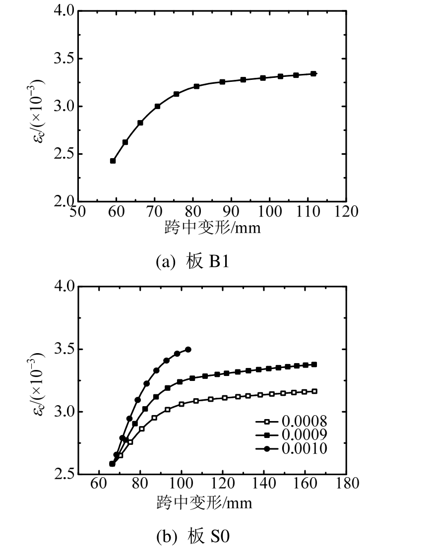 图16 (a)和图16(b)给出了板S0和板B1的εc与变形的关系曲线。一方面,当