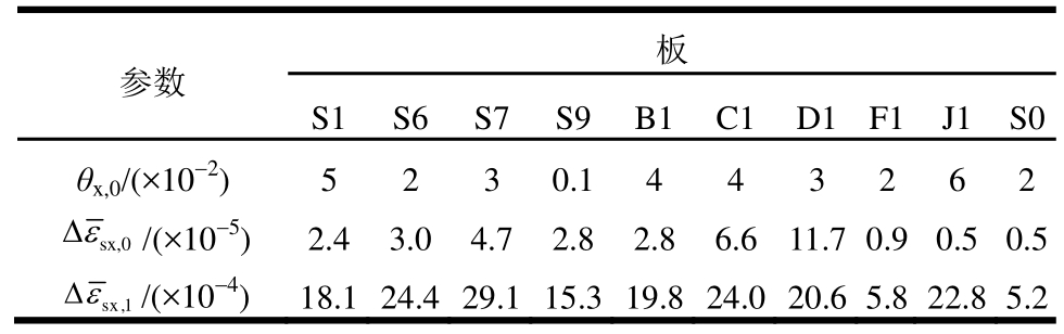 由表1可知,除试验板S9外,试验板屈服荷载时θx,0基本在 0.02~0.06[17,24-25],进而θx,0取值为0.05。此外,采用有限元理论,所得试验板屈服荷载时