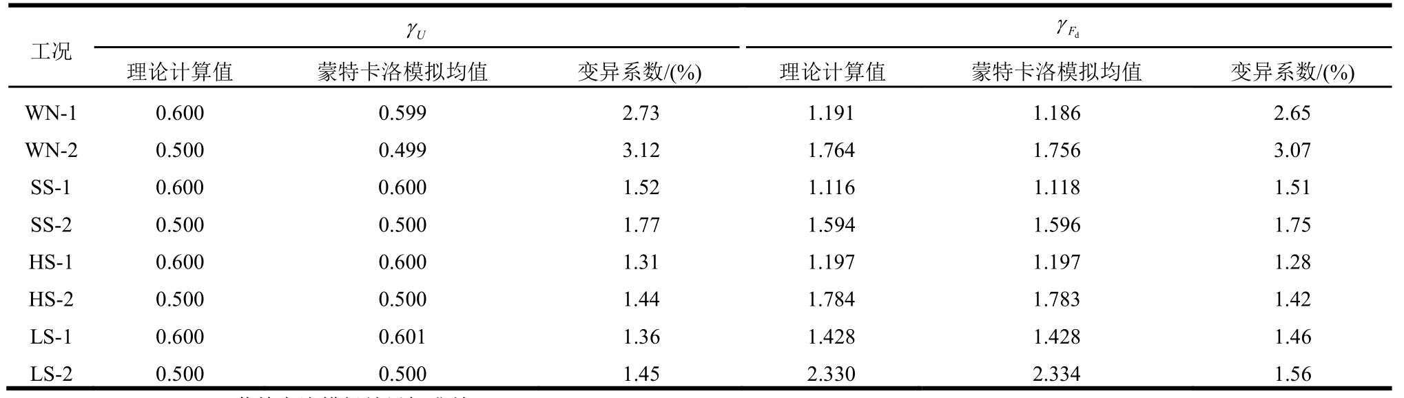 工况UγFγd理论计算值 蒙特卡洛模拟均值 变异系数/(%) 理论计算值 蒙特卡洛模拟均值 变异系数/(%)WN-1 0.600 0.599 2.73 1.191 1.186 2.65 WN-2 0.500 0.499 3.12 1.764 1.756 3.07 SS-1 0.600 0.600 1.52 1.116 1.118 1.51 SS-2 0.500 0.500 1.77 1.594 1.596 1.75 HS-1 0.600 0.600 1.31 1.197 1.197 1.28 HS-2 0.500 0.500 1.44 1.784 1.783 1.42 LS-1 0.600 0.601 1.36 1.428 1.428 1.46 LS-2 0.500 0.500 1.45 2.330 2.334 1.56