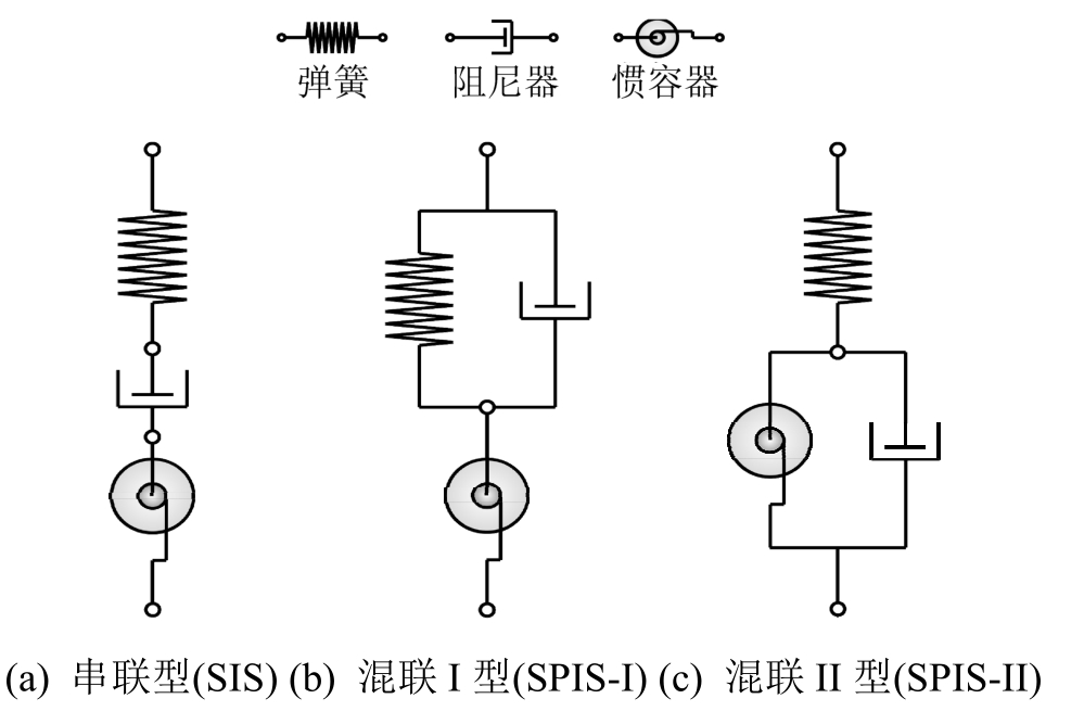 目前针对惯容的研究方兴未艾,不同学者按照自己的理解为利用惯容机制的减震装置命名,如旋转质量阻尼器、动态质量阻尼器、调谐黏滞质量阻尼器等等,造成惯容减震装置命名混乱,不成体系。因为惯容减震装置的减震机理由调谐、能量转移、能量耗散等多方面因素构成,并不同于传统意义的阻尼器,因此本文不建议使用“阻尼器”这一称谓对其命名。实际上一个惯容减震装置中已完整包含了一个动力学体系应具备的基本元素(即运动方程中包含了加速度项、速度项、位移项),所以可以认为其自成系统,故本文建议将利用惯容机制进行减震控制的装置称为惯容减震系统(inerter system,IS)。对于只包含三种基本力学元件(即惯容器、阻尼器和弹簧各一个)的惯容系统,主要有三种有效的力学连接形式[25]:三元件串联的串联型惯容系统(series inerter system,SIS,见图2(a))、弹簧和阻尼器并联后与惯容器串联的混联 I型惯容系统(series-parallel-i inerter system,SPIS-I,见图 2(b))、惯容器和阻尼器并联后与弹簧串联的混联II型惯容系统(series-parallel-II inerter system,SPIS-II,见图2(c))。图3是以混联II型惯容系统(SPIS-II)为例给出的惯容系统构造示意图[13]。三种惯容系统中,串联型惯容系统(SIS)和混联I型(SPIS-I)与TMD的力学连接形式类似(加速度相关元件均与阻尼器串联),因此,用于TMD系统的最优调谐准则(即定点理论)[4]可用于SIS和SPIS-I的参数设计。而混联II型惯容系统(SPIS-II)中惯容器与阻尼器是并联的形式,跟TMD完全不同(TMD无法实现这种连接形式),因此定点理论在该种情况下并不适用[14],需要找到一种改进的设计方法,这也是本文要研究的主要内容。