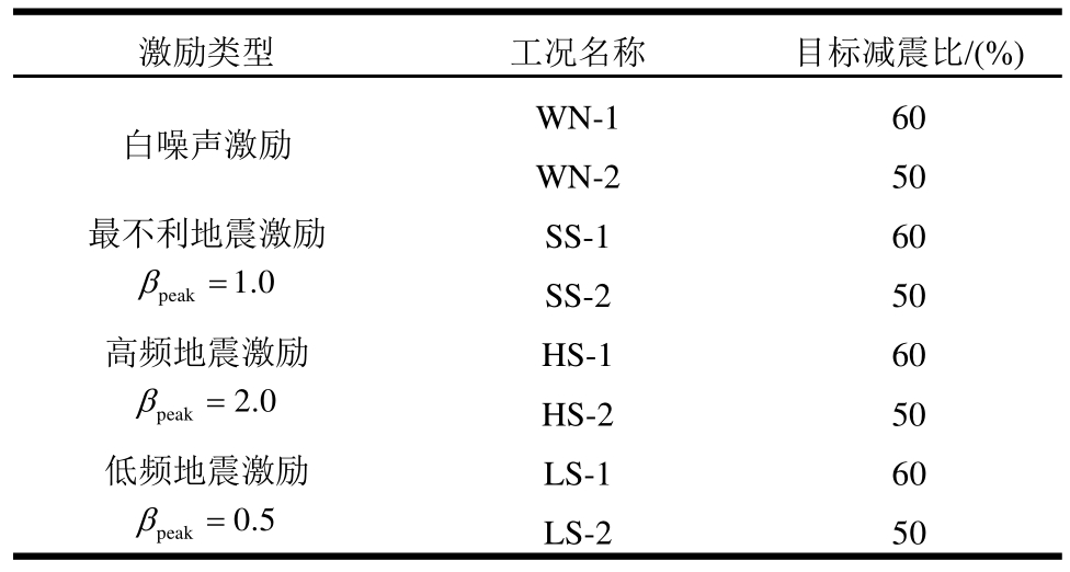 激励类型 工况名称 目标减震比/(%)WN-2 50最不利地震激励peak1.0白噪声激励 WN-1 60 SS-1 60 SS-2 50高频地震激励peak2.0β=HS-1 60 HS-2 50低频地震激励peak0.5β=β=LS-1 60 LS-2 50