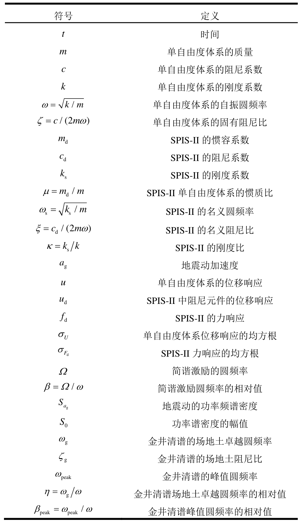 符号 定义t时间m单自由度体系的质量c单自由度体系的阻尼系数k单自由度体系的刚度系数/km ζωω=单自由度体系的自振圆频率/(2 )=单自由度体系的固有阻尼比cmmSPIS-II的惯容系数dcSPIS-II的阻尼系数kSPIS-II的刚度系数dsμ=SPIS-II单自由度体系的惯质比d/mmskms/ξω ω=SPIS-II的名义圆频率d/(2 )=cmSPIS-II的名义阻尼比κ=SPIS-II的刚度比skka地震动加速度u单自由度体系的位移响应guSPIS-II中阻尼元件的位移响应dfSPIS-II的力响应Uσ单自由度体系位移响应的均方根dβ=Ωω简谐激励圆频率的相对值FσSPIS-II力响应的均方根Ω简谐激励的圆频率/dS地震动的功率频谱密度gaS功率谱密度的幅值gω金井清谱的场地土卓越圆频率gζ金井清谱的场地土阻尼比0ω金井清谱的峰值圆频率peakη=ωω金井清谱场地土卓越圆频率的相对值gβωωpeak=peak/ 金井清谱峰值圆频率的相对值