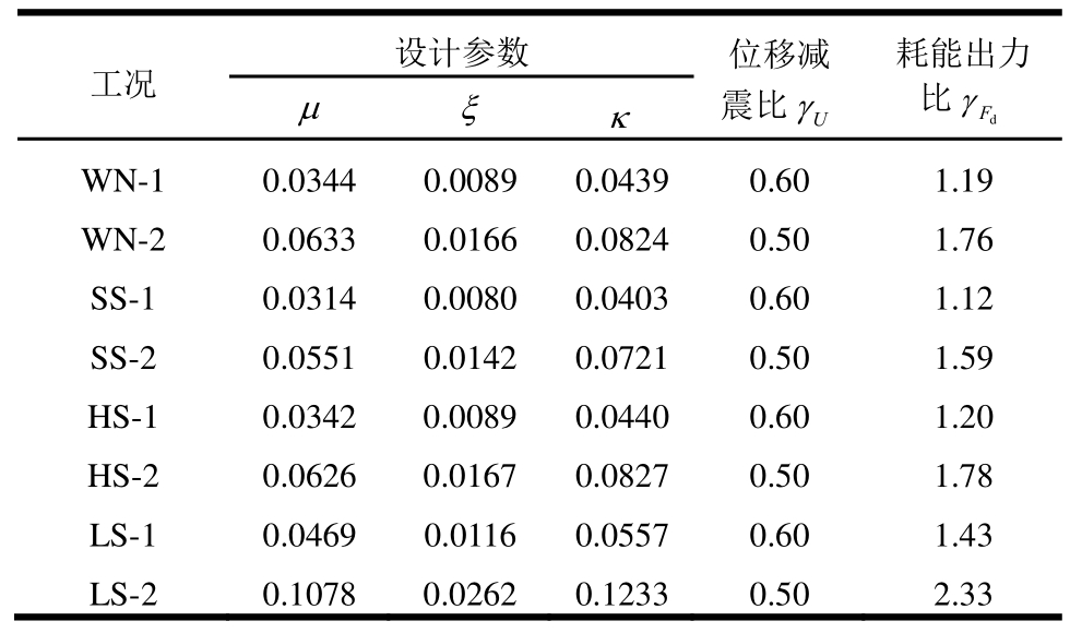 工况 设计参数 位移减震比Uγμξκ耗能出力比FdγWN-1 0.0344 0.0089 0.0439 0.60 1.19 WN-2 0.0633 0.0166 0.0824 0.50 1.76 SS-1 0.0314 0.0080 0.0403 0.60 1.12 SS-2 0.0551 0.0142 0.0721 0.50 1.59 HS-1 0.0342 0.0089 0.0440 0.60 1.20 HS-2 0.0626 0.0167 0.0827 0.50 1.78 LS-1 0.0469 0.0116 0.0557 0.60 1.43 LS-2 0.1078 0.0262 0.1233 0.50 2.33