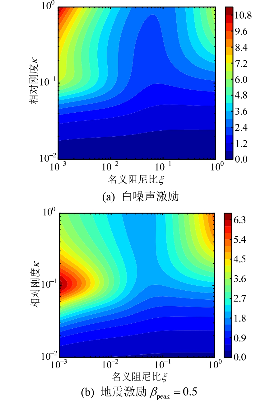 比较表3中不同激励下的参数值可得:白噪声、最不利地震、高频地震激励下的优化设计参数值相近,而低频地震激励下的参数值与其他三种情况存在显著差异。为简化计算,SPIS-II单自由度体系的优化参数设计可以初步假定输入为白噪声,当输入激励的卓越频率较低(相对于结构自振频率)时应谨慎采用白噪声假定。此外,结构的固有阻尼比也会对单自由度体系的设计结果产生影响。