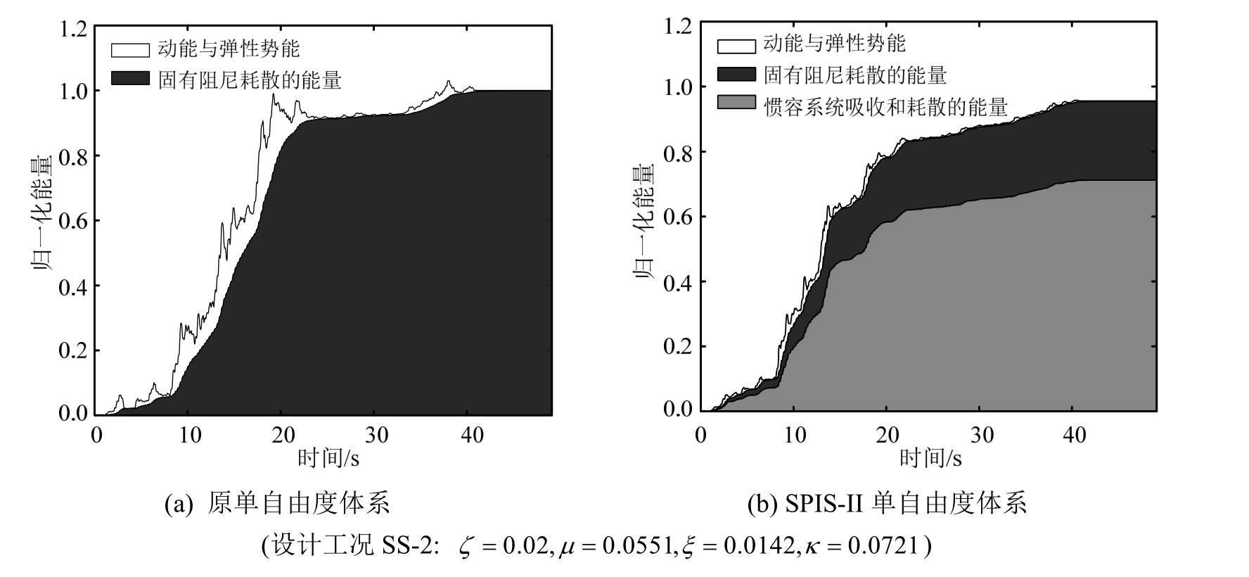 图8、图9为最不利地震工况(SS-2)下的时程位移曲线和能量响应曲线,图中可以反映出 SPIS-II对原结构动力响应的减震效果。由位移响应曲线(图8)可看出,在整个振动过程中体系的响应都得到了有效控制,响应峰值区域的控制效果尤为显著;由能量响应曲线(图9)可看出,尽管SPIS-II的名义阻尼比ξ=0.0142小于体系固有阻尼比ζ=0.02,但SPIS-II却比体系的固有阻尼吸收耗散掉更多的能量(约 3倍),这表明惯容可以显著提高与之并联阻尼单元的耗能效率。