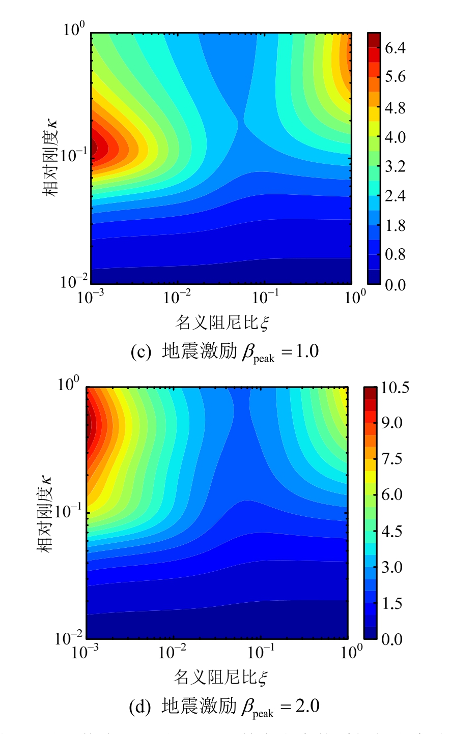 图7 不同激励下配置SPIS-II单自由度体系耗能出力响应等值线图(ζ=0.02,μ=0.1)