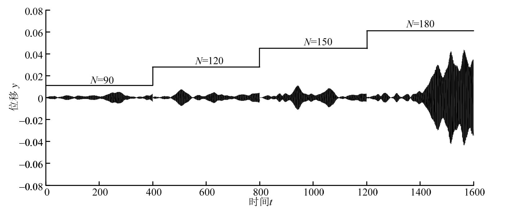 最后,采用蒙特卡罗数值模拟对式(7)进行了仿真计算,图6为其中100个样本的模拟平均结果,计算了不同人数(阶梯递增,90~180)下的桥梁横向位移响应。从图中可知,当人数不超过150时,桥梁横向位移皆保持在有限振幅内,当人数达到 180的时候,已有发散大幅振动现象,也就是说,导致发散失稳的行人数在150~180区间,这和前面的理论结果一致。