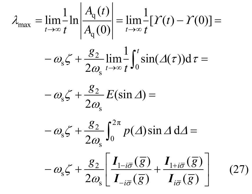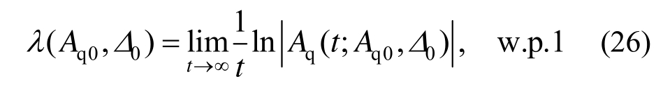 式中:w.p.1表示概率为1成立;Aq0、0Δ为初始值。由式(25)、式(26)以及Δ(t)的遍历性[39],可求得最大Lyapunov指数λmax为: