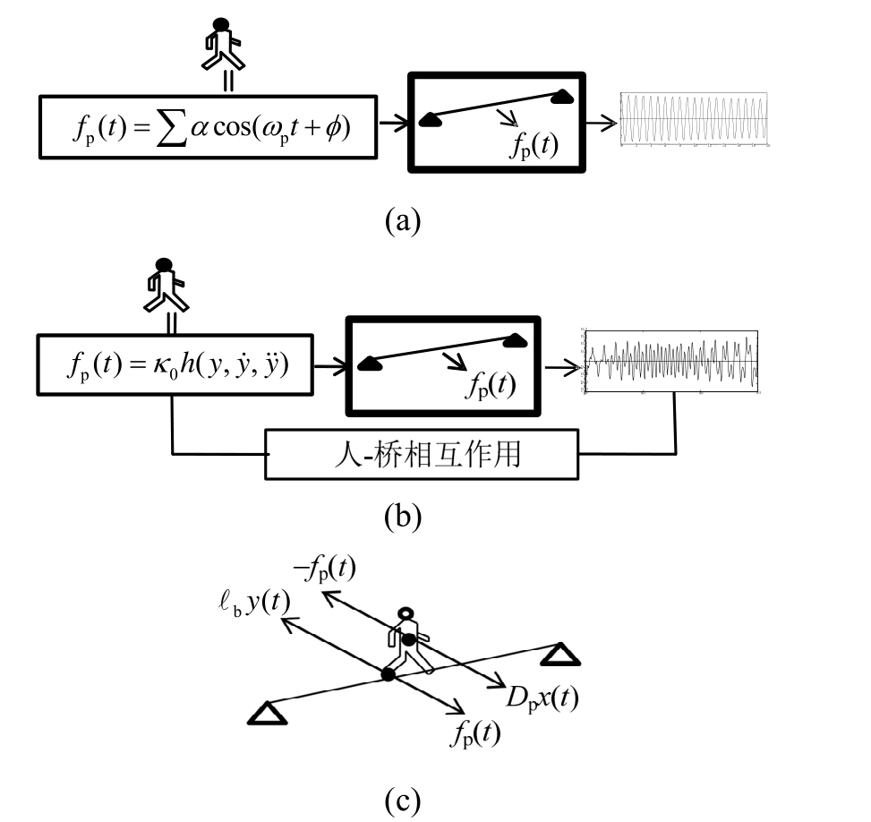 1) 行人激励作用与桥梁振动无关(图1(a))。这类方法一般假设行人激励与桥梁响应无关,其中具有代表性的是线性直接共振理论,将桥梁大幅度横向振动视为由行人横向步频与桥梁某阶频率共振而造成。单人横向荷载可采用简谐函数表示。日本学者 Fujino等[3-4]利用这类方法对日本户田公园T桥进行了系统研究。