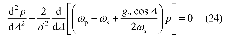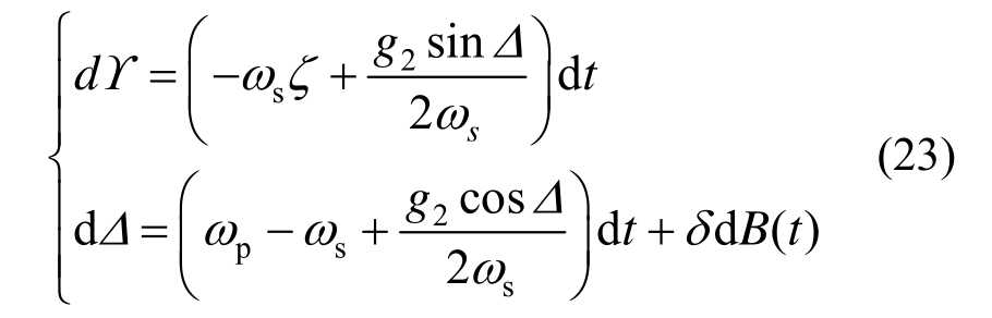 式中,Λ=δB(t)+Φ。这里考虑主共振:ωp/ωs=1+σ,σ为调谐参数。引入新变量Δ:Δ=-θ+σΨ+Λ,结合前述变换式,此时有: