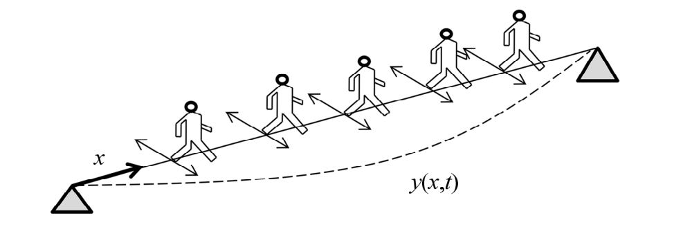 考虑行人作用下的人行桥横向振动(图2),忽略转动惯量,轴向力以及剪切变形影响,基于欧拉-伯努利梁的人行桥横向弯曲振动方程可表示为: