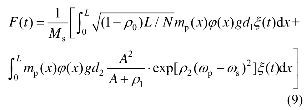 随着振动的进行,式(5)右边第一项非同步人群荷载中的ρ(A,Δω)将趋向于常数ρ0,其只对前期的非同步人群荷载引起的振动产生影响,而对后期以同步人群荷载为主的振动影响很小,且对稳定性也无影响。若假设人群在全桥长度L上均布分布,单位长度密度为mp(x)=Nmps/L,基于式(6),单位长度的人群横向荷载为: