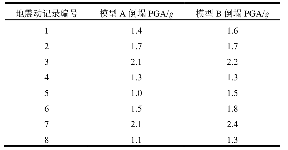 地震动记录编号 模型A倒塌PGA/g模型B倒塌PGA/g1 1.4 1.6 2 1.7 1.7 3 2.1 2.2 4 1.3 1.3 5 1.0 1.5 6 1.5 1.8 7 2.1 2.4 8 1.1 1.3