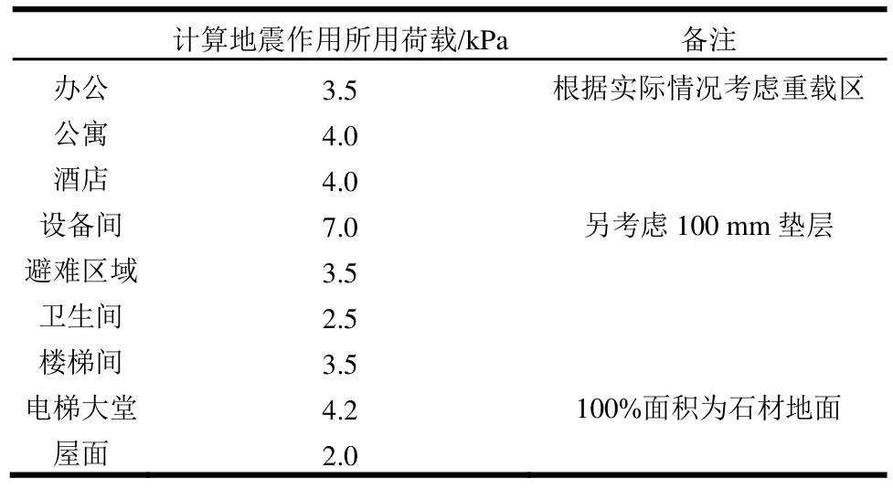 计算地震作用所用荷载/kPa 备注办公 3.5 根据实际情况考虑重载区公寓 4.0酒店 4.0设备间 7.0 另考虑100 mm垫层避难区域 3.5卫生间 2.5楼梯间 3.5电梯大堂 4.2 100%面积为石材地面屋面 2.0