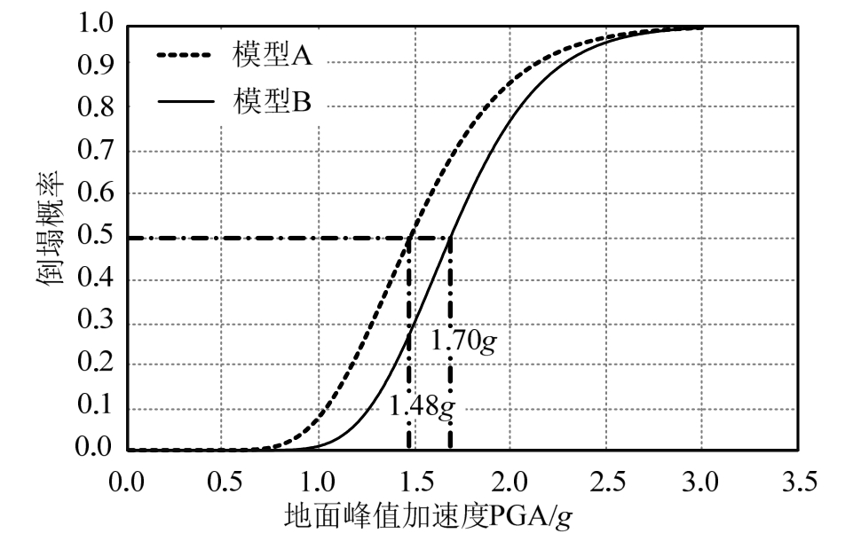 Fig.8 Comparison of collapse-fragility curves for Model A and Model B