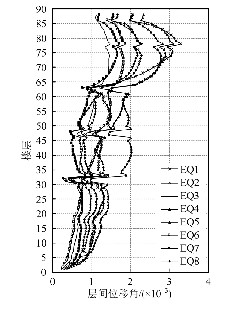 模型B在8条地震动记录下的层间位移角包络图如图6所示,平均值如图5所示。与模型A类似,8条地震动记录下的整体变形模式较相近,各地震动记录下最大层间位移角均发生在78层附近。最大层间位移角的平均值为1/429,与模型A接近,远低于《高规》罕遇地震下1/100层间位移角的限值。