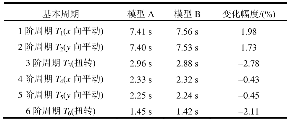 基本周期 模型A 模型B 变化幅度/(%)1阶周期T1(x向平动) 7.41 s 7.56 s 1.98 2阶周期T2(y向平动) 7.40 s 7.53 s 1.73 3阶周期T3(扭转) 2.96 s 2.88 s -2.78 4阶周期T4(x向平动) 2.33 s 2.32 s -0.43 5阶周期T5(y向平动) 2.25 s 2.24 s -0.45 6阶周期T6(扭转) 1.45 s 1.42 s -2.11