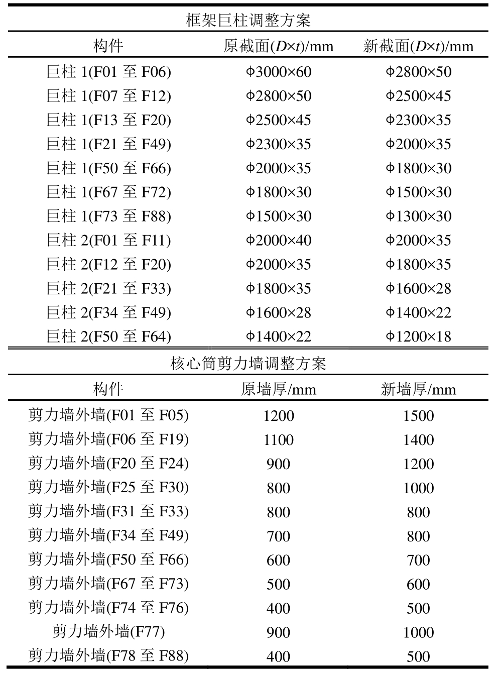 框架巨柱调整方案构件 原截面(D×t)/mm 新截面(D×t)/mm巨柱1(F01至F06) φ3000×60 φ2800×50巨柱1(F07至F12) φ2800×50 φ2500×45巨柱1(F13至F20) φ2500×45 φ2300×35巨柱1(F21至F49) φ2300×35 φ2000×35巨柱1(F50至F66) φ2000×35 φ1800×30巨柱1(F67至F72) φ1800×30 φ1500×30巨柱1(F73至F88) φ1500×30 φ1300×30巨柱2(F01至F11) φ2000×40 φ2000×35巨柱2(F12至F20) φ2000×35 φ1800×35巨柱2(F21至F33) φ1800×35 φ1600×28巨柱2(F34至F49) φ1600×28 φ1400×22巨柱2(F50至F64) φ1400×22 φ1200×18核心筒剪力墙调整方案构件 原墙厚/mm 新墙厚/mm剪力墙外墙(F01至F05) 1200 1500剪力墙外墙(F06至F19) 1100 1400剪力墙外墙(F20至F24) 900 1200剪力墙外墙(F25至F30) 800 1000剪力墙外墙(F31至F33) 800 800剪力墙外墙(F34至F49) 700 800剪力墙外墙(F50至F66) 600 700剪力墙外墙(F67至F73) 500 600剪力墙外墙(F74至F76) 400 500剪力墙外墙(F77) 900 1000剪力墙外墙(F78至F88) 400 500