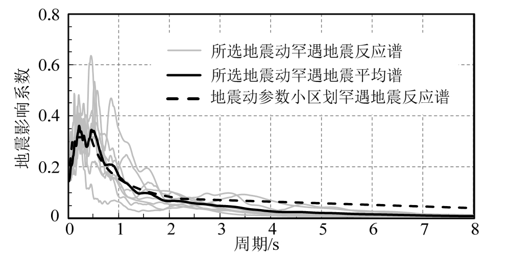 从FEMA P695[28]推荐的22组远场地震动中选取其中7条,再加上常用的El-Centro波,共8条地震动记录作为基本地震输入,并将地震加速度峰值 PGA调整至该超高层相应大震水平。需要说明的是,该超高层所在区域为武汉,依据该超高层超限审查报告,该超高层设计时采用的地震动参数及地震影响系数函数以武汉市主城规划地震动参数小区划结果为基准,并结合专家意见,取大震PGA为140 cm/s2,故本研究中对于此超高层的大震PGA亦取140 cm/s2。所选8条地震动记录的平均反应谱与武汉市主城规划地震动参数小区划罕遇地震反应谱的对比如图3所示。
