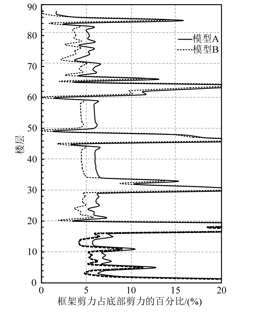 图2 两超高层模型弹性设计下的框架地震剪力分担比对比